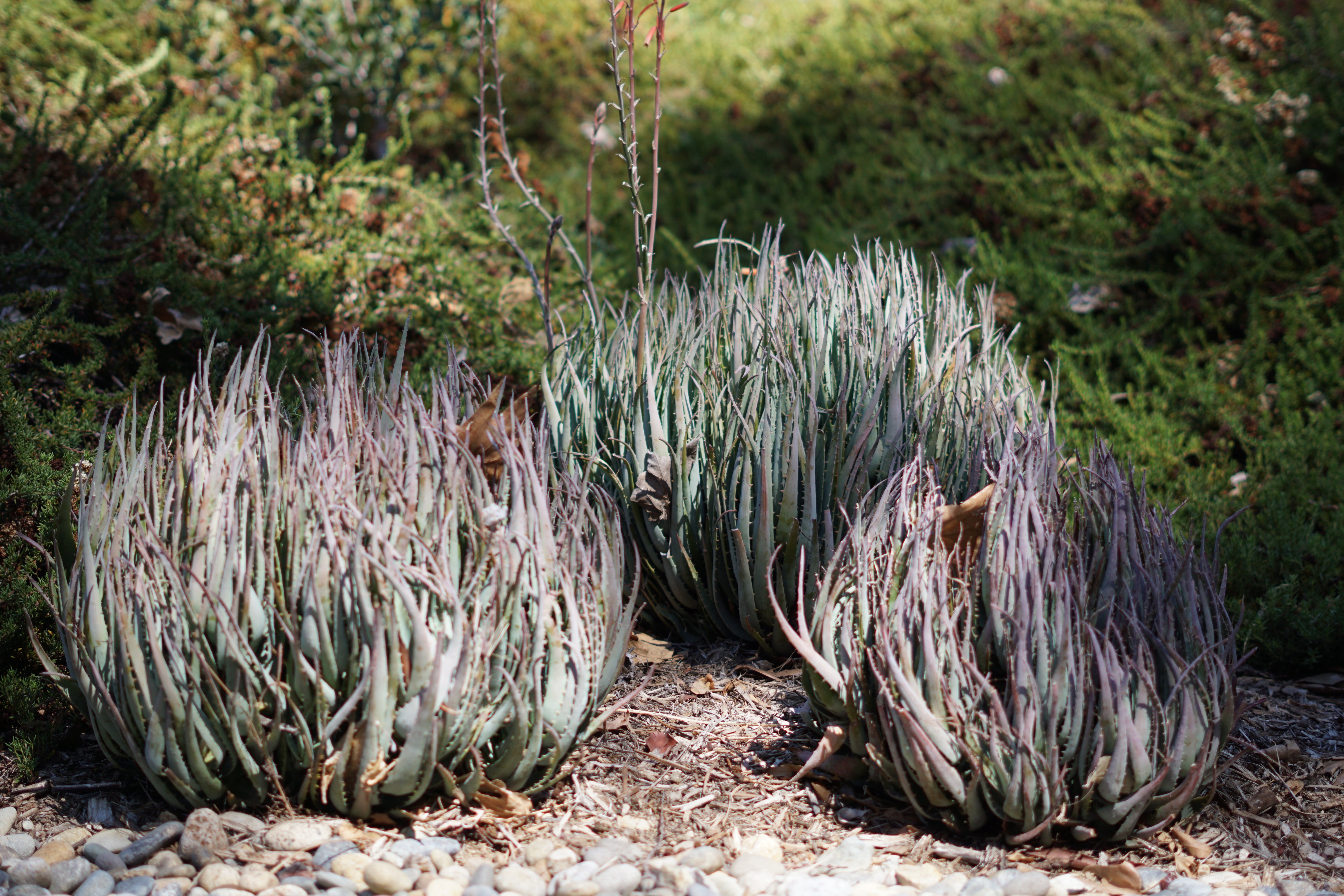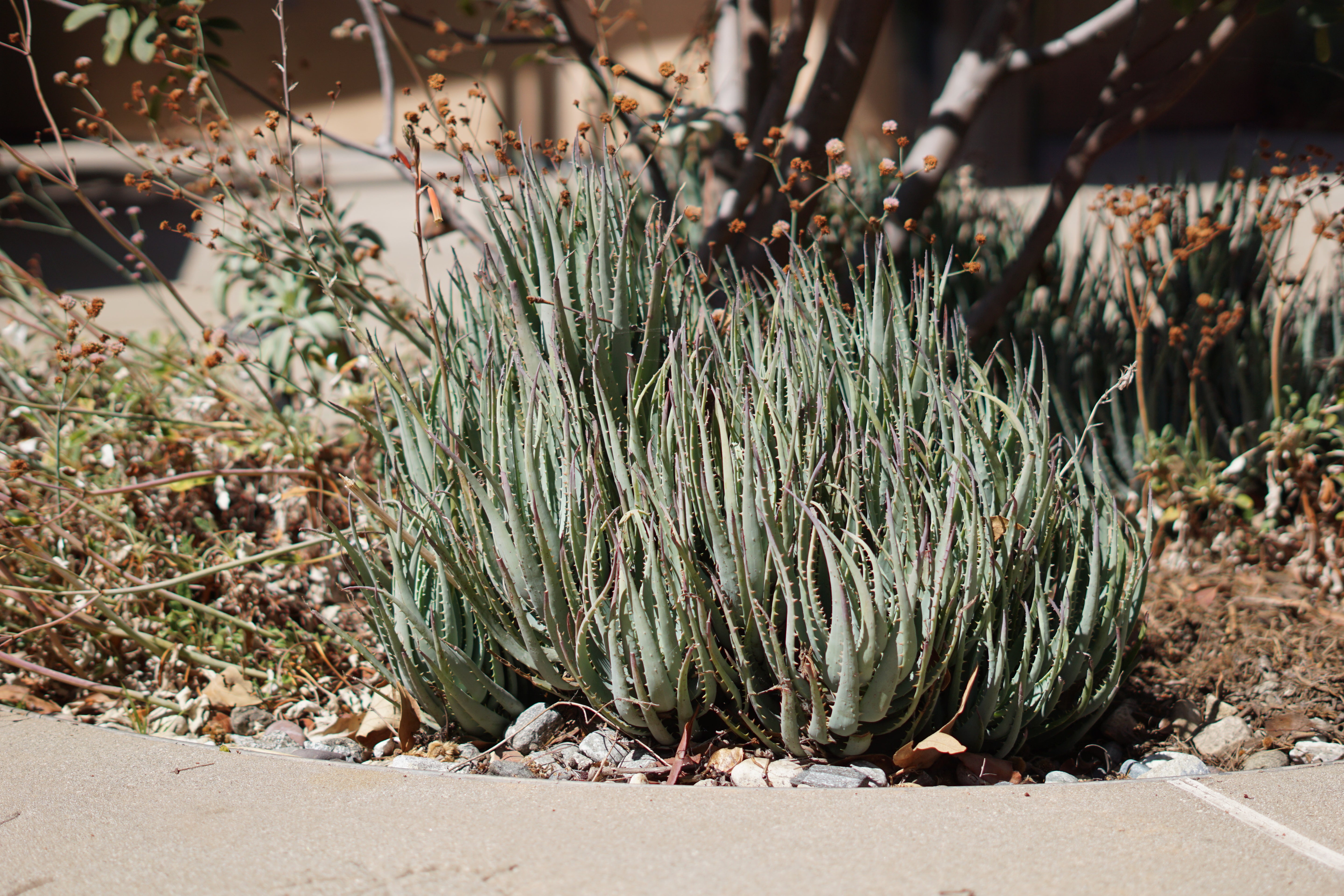 Easy small Aloe with bright red flowers winter to spring loved by hummingbirds. Great for parkways, driveway edges, or other difficult hot and narrow areas.