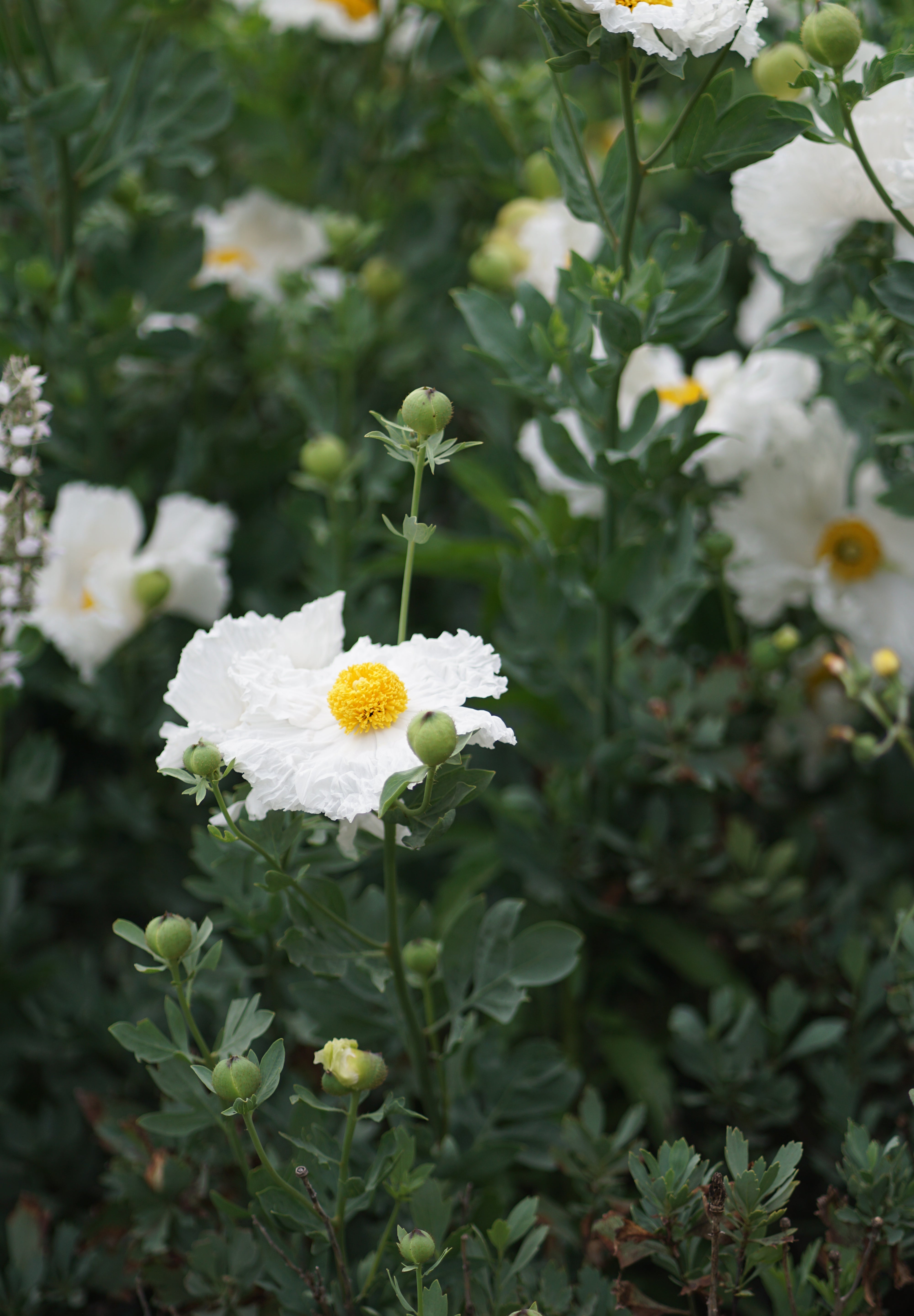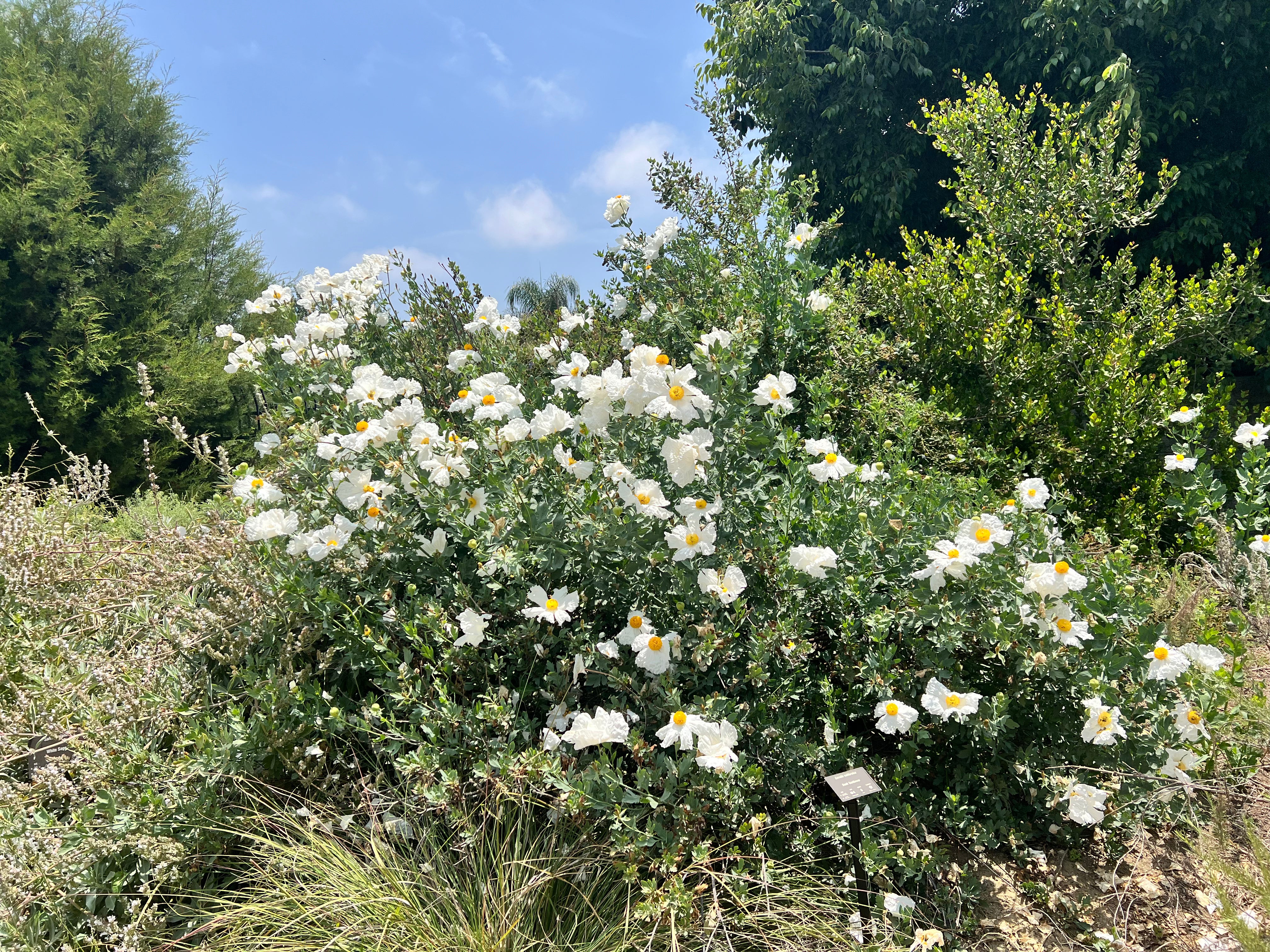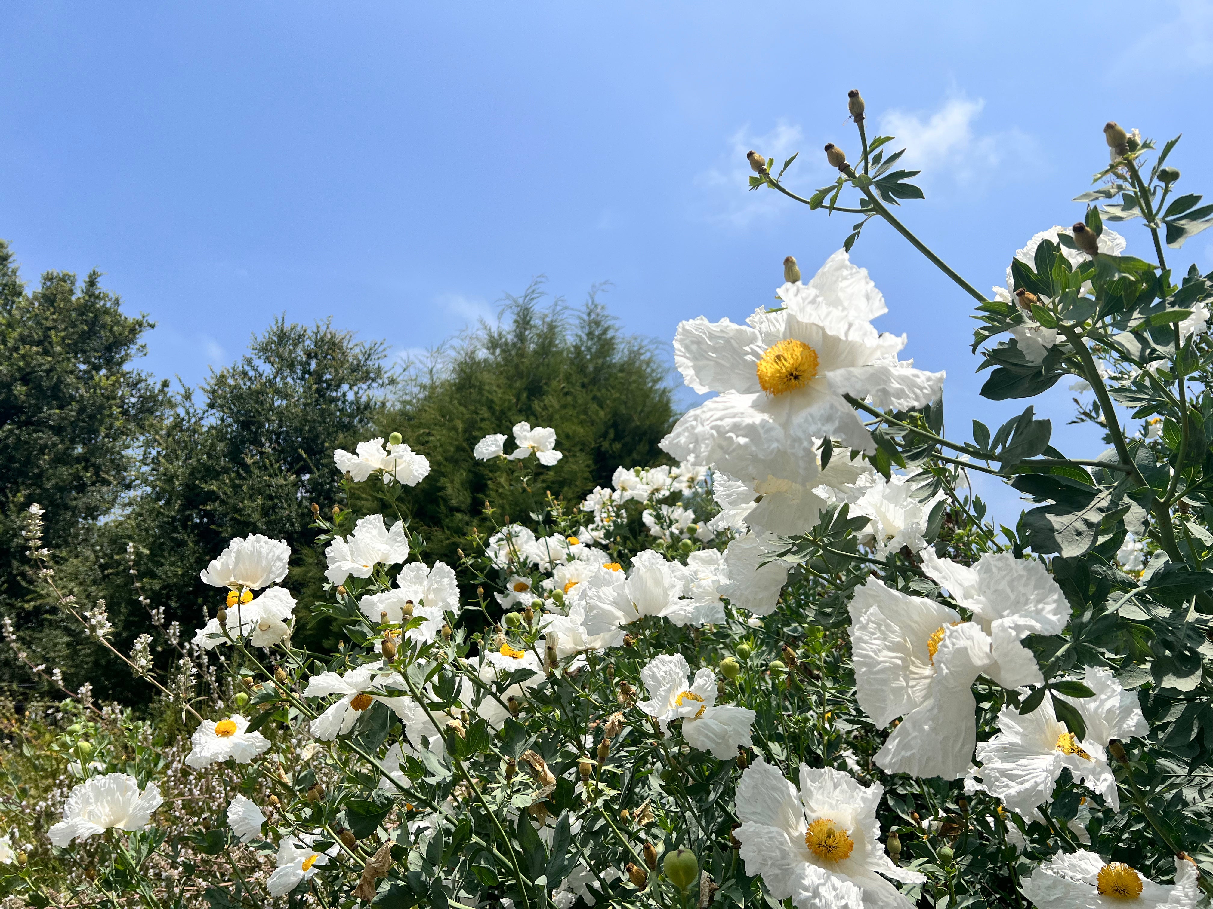 One of California's most striking perennial plants, with large flowers that looks like a fried egg. Matilija poppy grows fast, 6 - 10 ft fall and spreads aggressively. It thrives in well-drained soils with little summer water. Has sensitive roots, don't disturb while planting. Cut it down to the ground in the fall for fresh spring growth - perfect for slopes! Use a shovel and dig out rhizomatic shoots to control the spread.