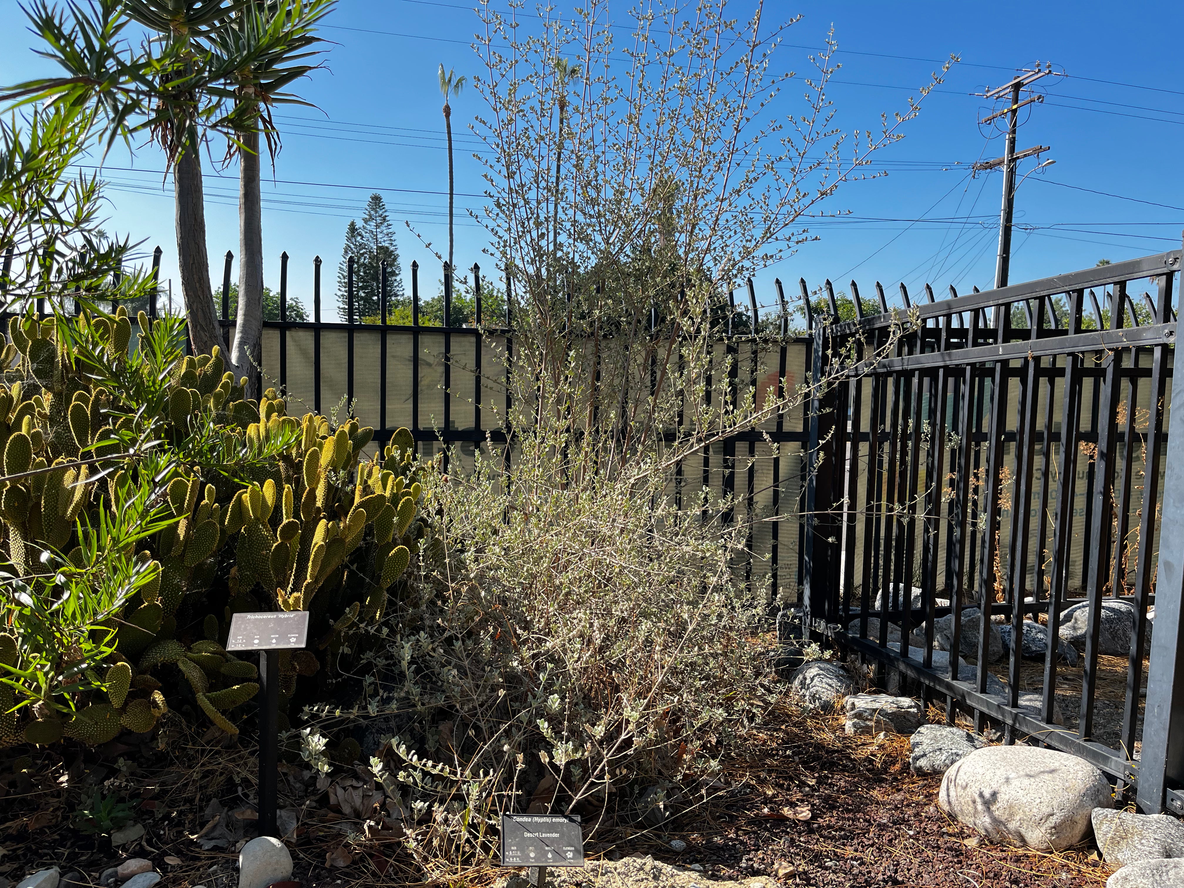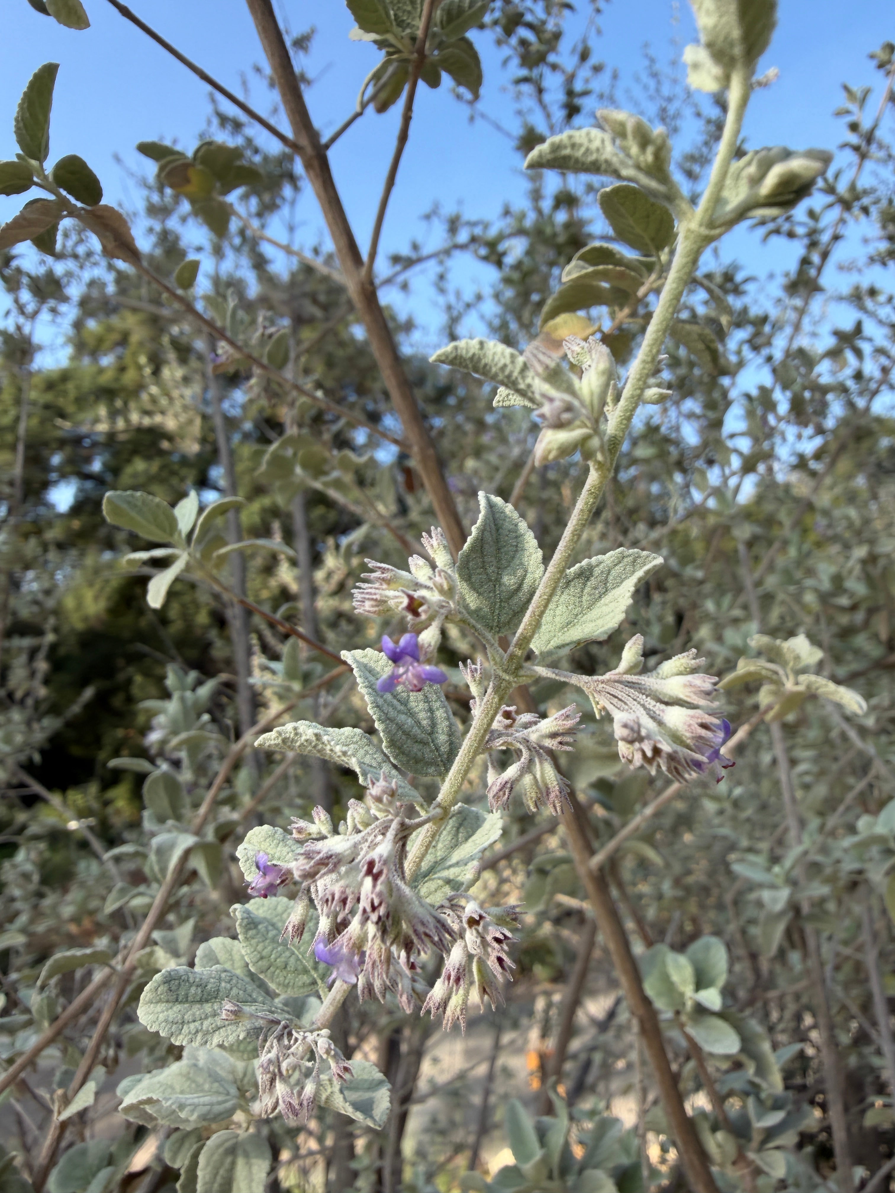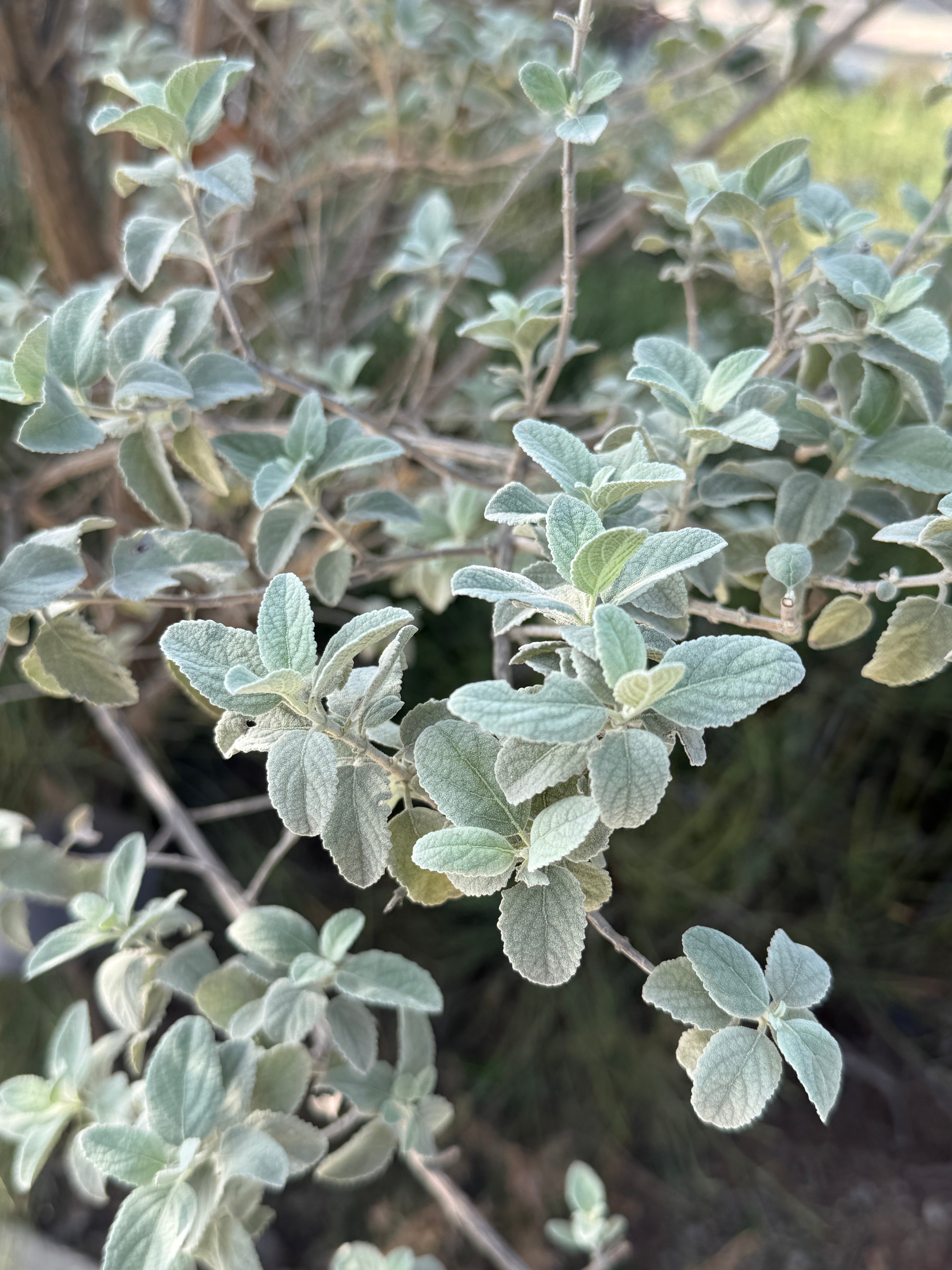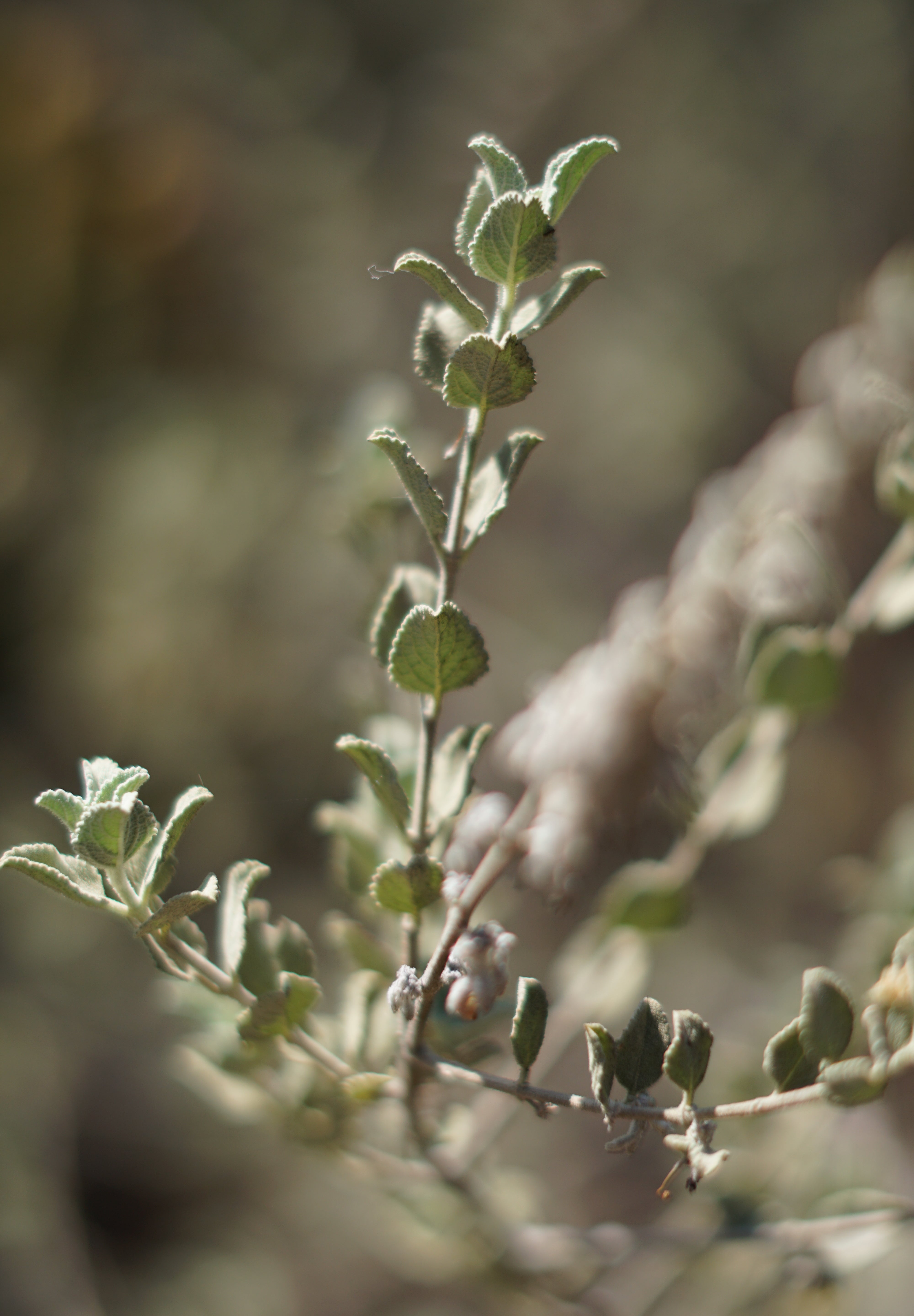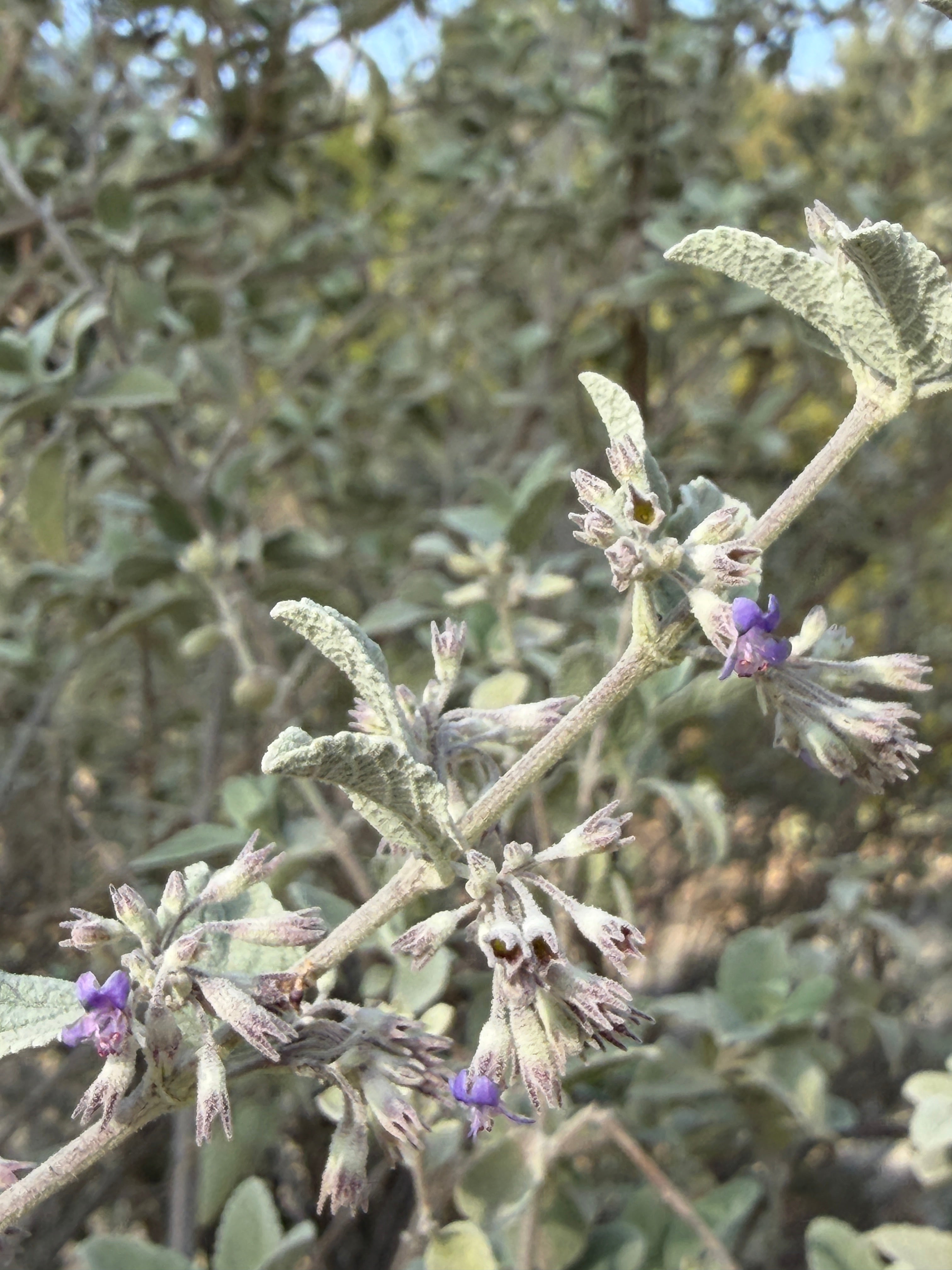 Tough upright desert shrub with silvery delightful-smelling foliage and early spring light or deep purple blooms used by hummingbirds and pollinators. Great as a background or accent plant. Almost like a mix between a sage and a lavender!