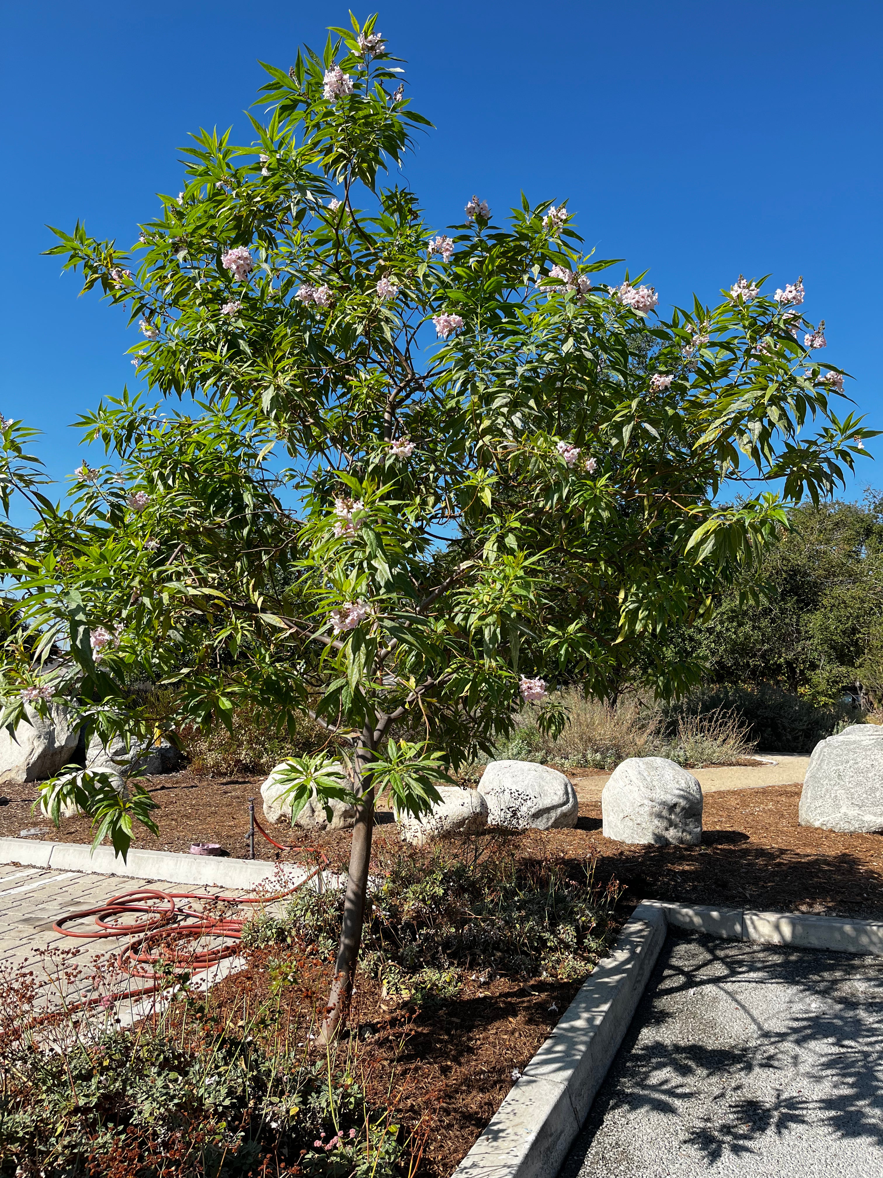 Fast-growing deciduous tree with dome-shaped canopy, pink trumpet blooms, and heat- and drought-tolerant foliage. Great for yards and streets. A hybrid of Catalpa and Desert Willow.